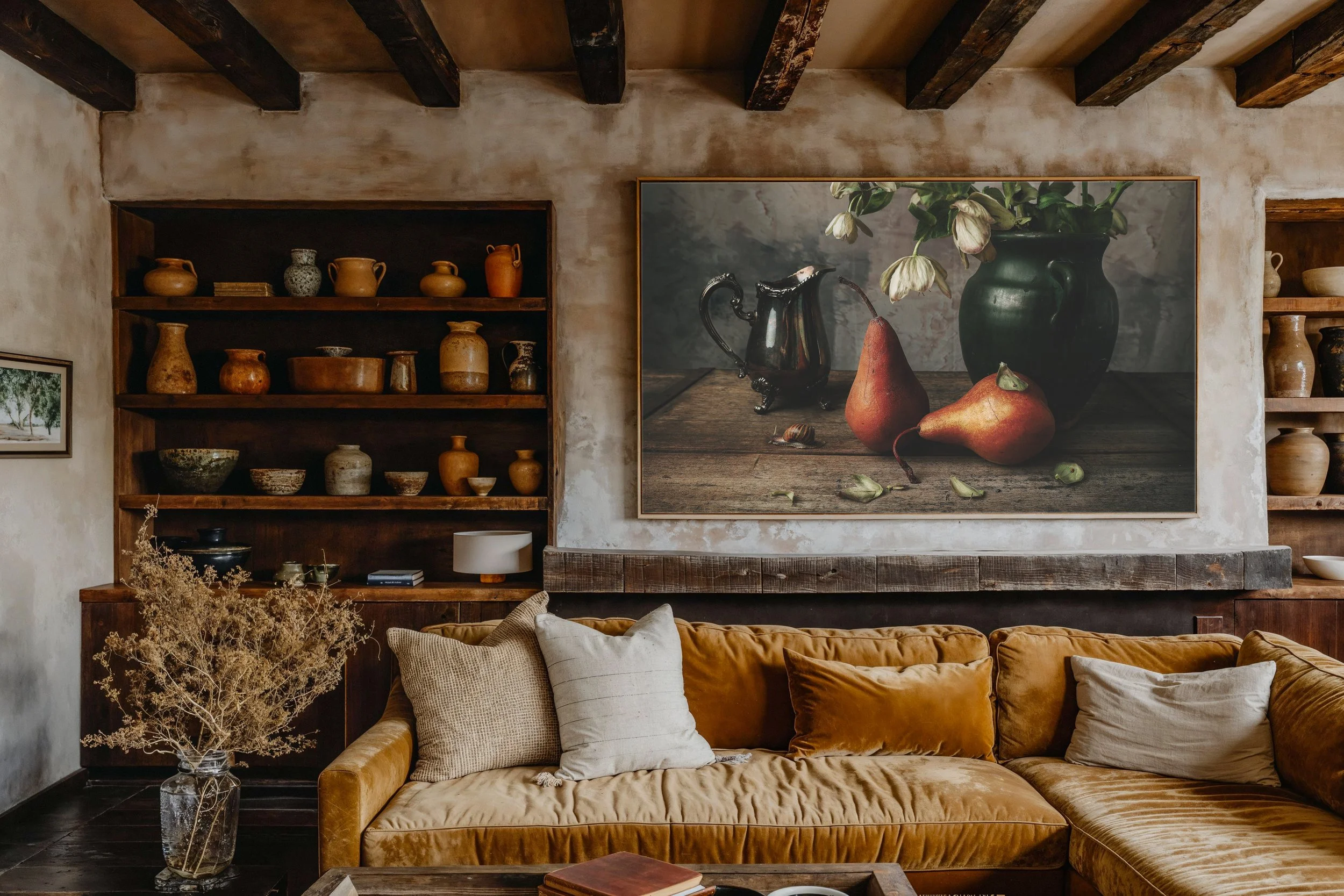 Introducing our Old World Charm Still Life Collection “Stories of Old” , where timeless elegance meets the warmth of nature's embrace. Picture-perfect moments captured in every detail, featuring two pairs of ripe, inviting pears, a weathered Kenmare Stoneware Flower vase adorned with aging flowers, and a gleaming silver creamer adding a touch of refinement. Amidst the rustic allure of a warm wood table, fallen leaves intertwine with the gentle crawl of a snail, while delicate Beatles find solace in nature's sanctuary. Complete with a stucco wall backdrop, each scene tells a story of old-world charm and rustic serenity. Bring the essence of countryside elegance in an Old Dutch Masters inspired style into your home with our Rustic Charm Still Life Collection.